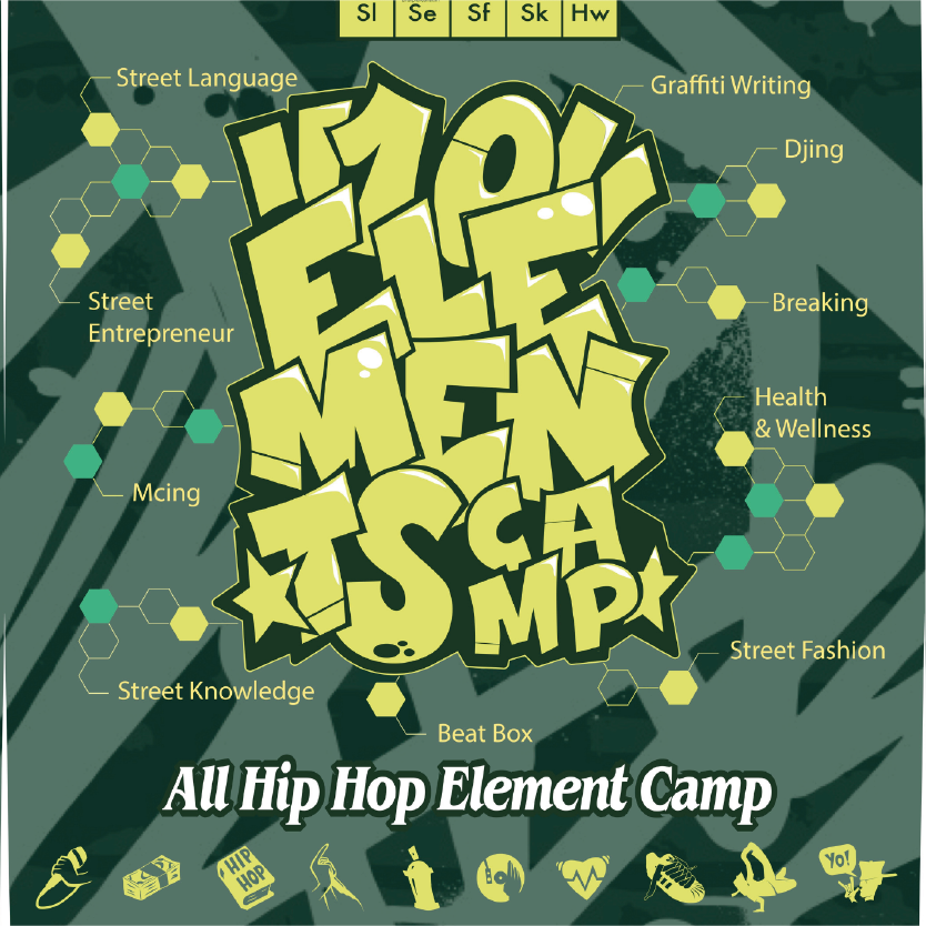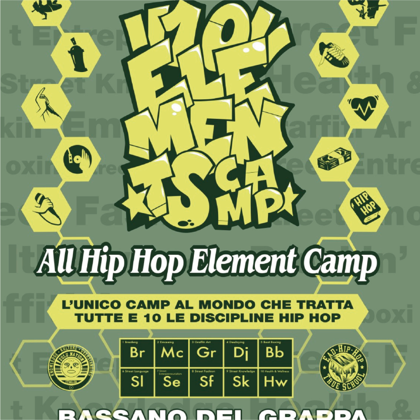Breaking, Emceeing, Graffiti Art (Writing), Deejaying, Beatboxing, Street Fashion, Street Language, Street Knowledge, Street Entrepreneurialism, Health & Wellness. Il Camp si svolgerà dal 23 al 27 luglio a Bassano del Grappa (VI), ed è dedicato a tutti: ragazzi dagli 8 anni in su e adulti. Si approfondirà la cultura Hip Hop dalle origini ad oggi tramite lezioni teoriche e pratiche, con artisti che nel corso degli anni si sono distinti. Il Camp si concluderà con “Freestyle Day”, una Jam che racchiuderà tutte le discipline affrontate, battle di breaking, Hip Hop Freestyle e Rap.