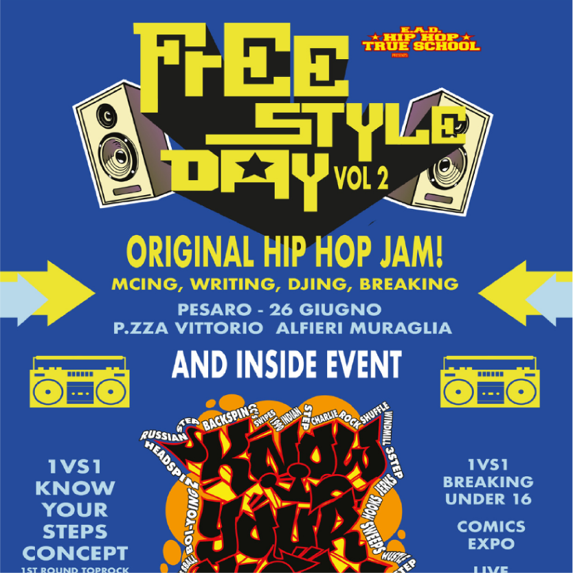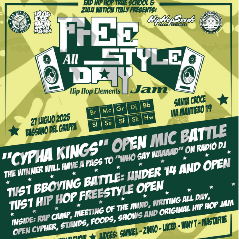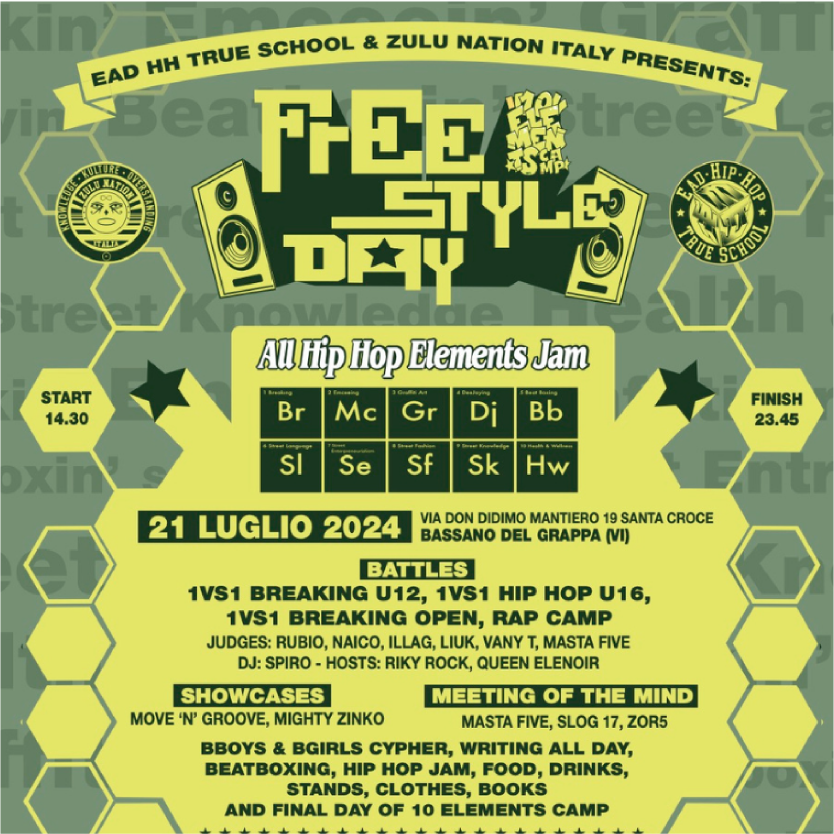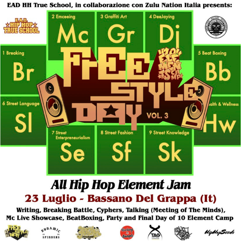 Da un idea di Queen Elenoir, Dal 2014 Freestyle Day nasce come una giornata dedicata a tutte le arti Freestyle: Graffiti, Live Paint, Performance, Ballo, Musica, Skate e tanto altro... Dalla prima edizione al “Funk Beach” di Pesaro si è poi trasformata in una vera e propria Jam Hip Hop fino ad approdare come evento finale del 10 Elements Camp di Bassano. Dal 2023 L’evento si svolge entro le prime 2 settimane di Luglio presso il campo da basket di Santa Croce ed è organizzato insieme a Zulu Nation Italy. La giornata inizia al mattino con Writers da tutta Italia che dipingono per tutto il giorno sul muro che circonda il campo da basket, si prosegue poi nel pomeriggio con il “Meeting of The Mind“ format di Zulu Nation in cui Ospiti Speciali sono invitati in un talking di Cultura Hip Hop e non solo, successivamente si passa alle battle di Breaking e Hip Hop Freestyle con i migliori B-Boys e B-Girls Per Concludere con il “Cypha Kings” di Masta Five dove i Rappers ed Mc si sfidano a rime per vincere la partecipazione su radio Deejay. Il Tutto si svolge in un ambiente “Familiare” e rilassato con stand gastronomici, abbigliamento, oggettistica, vinili che circondano tutto l’evento dove la musica è protagonista e gira per tutta la giornata. E’ un evento adatto, anzi consigliato alle famiglie e con gli anni è arrivato ad essere una delle attrattive principali dell’estate di Bassano.